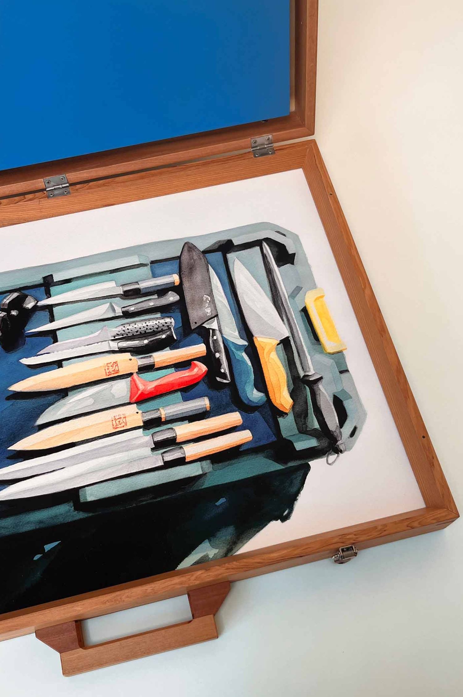 Maletín de madera con impresión Giclée (original en acuarela) y voz de Manuel Subercaseaux, Valparaíso y Cochamó. Tamaño 61 x 47 x 10 cms.