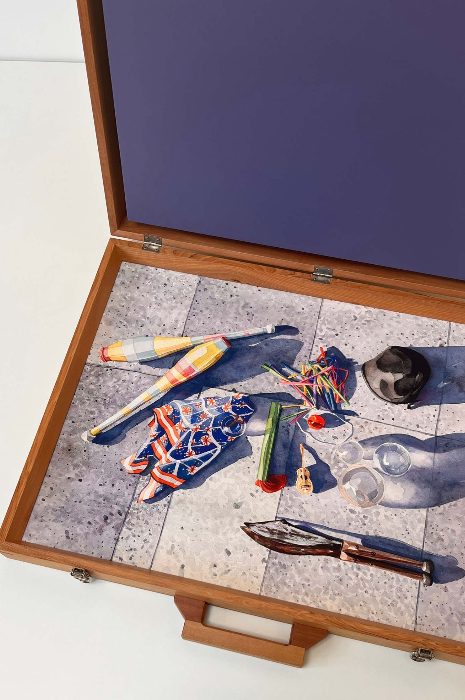 Maletín de madera con impresión Giclée (original en acuarela) y voz de Mauricio Orellana, Valdivia. Tamaño 61 x 47 x 10 cms.
