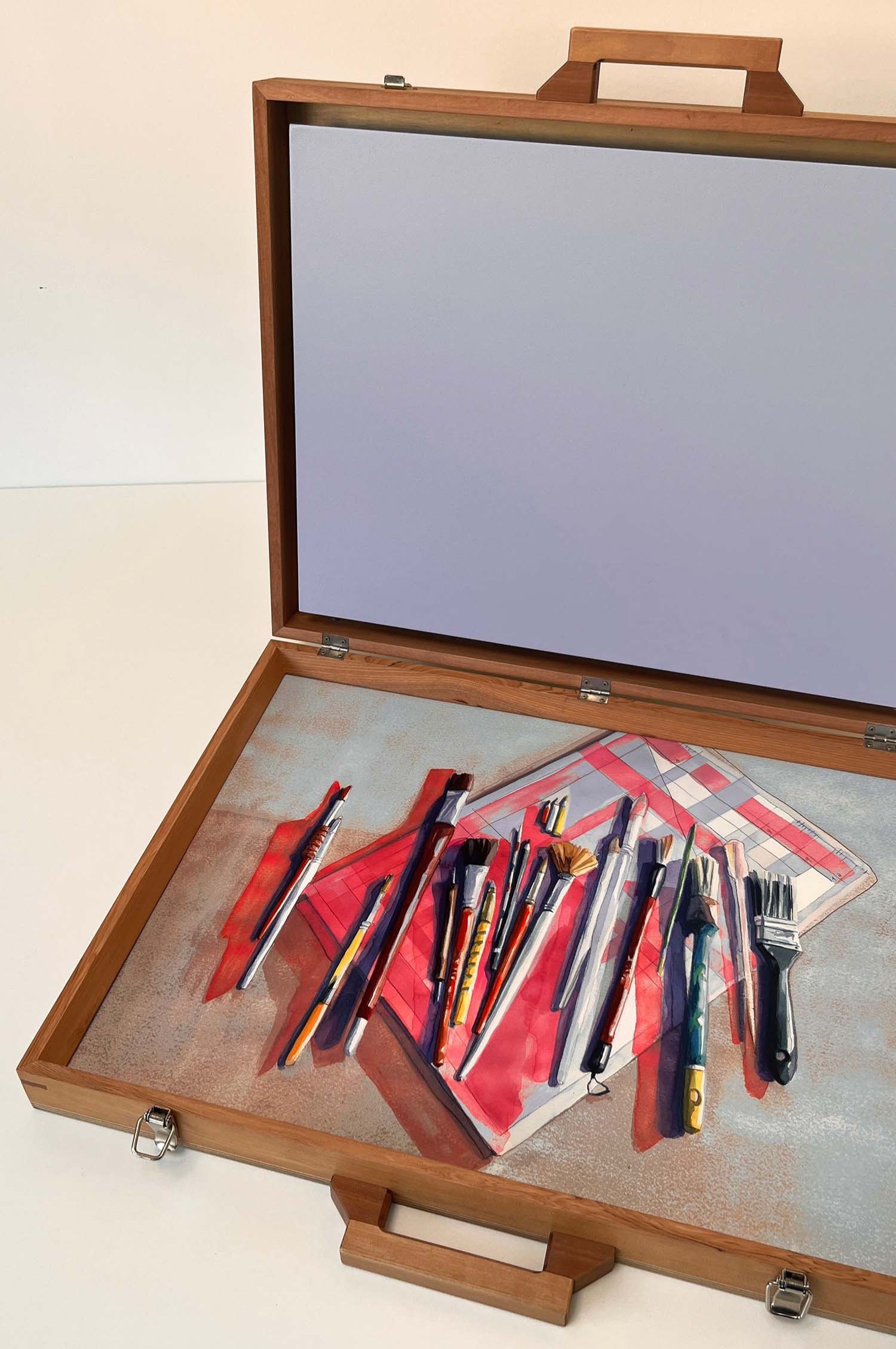 Maletín de madera con impresión Giclée (original en acuarela) y voz de Pilar Galilea, Ñuñoa. Tamaño 61 x 47 x 10 cms.