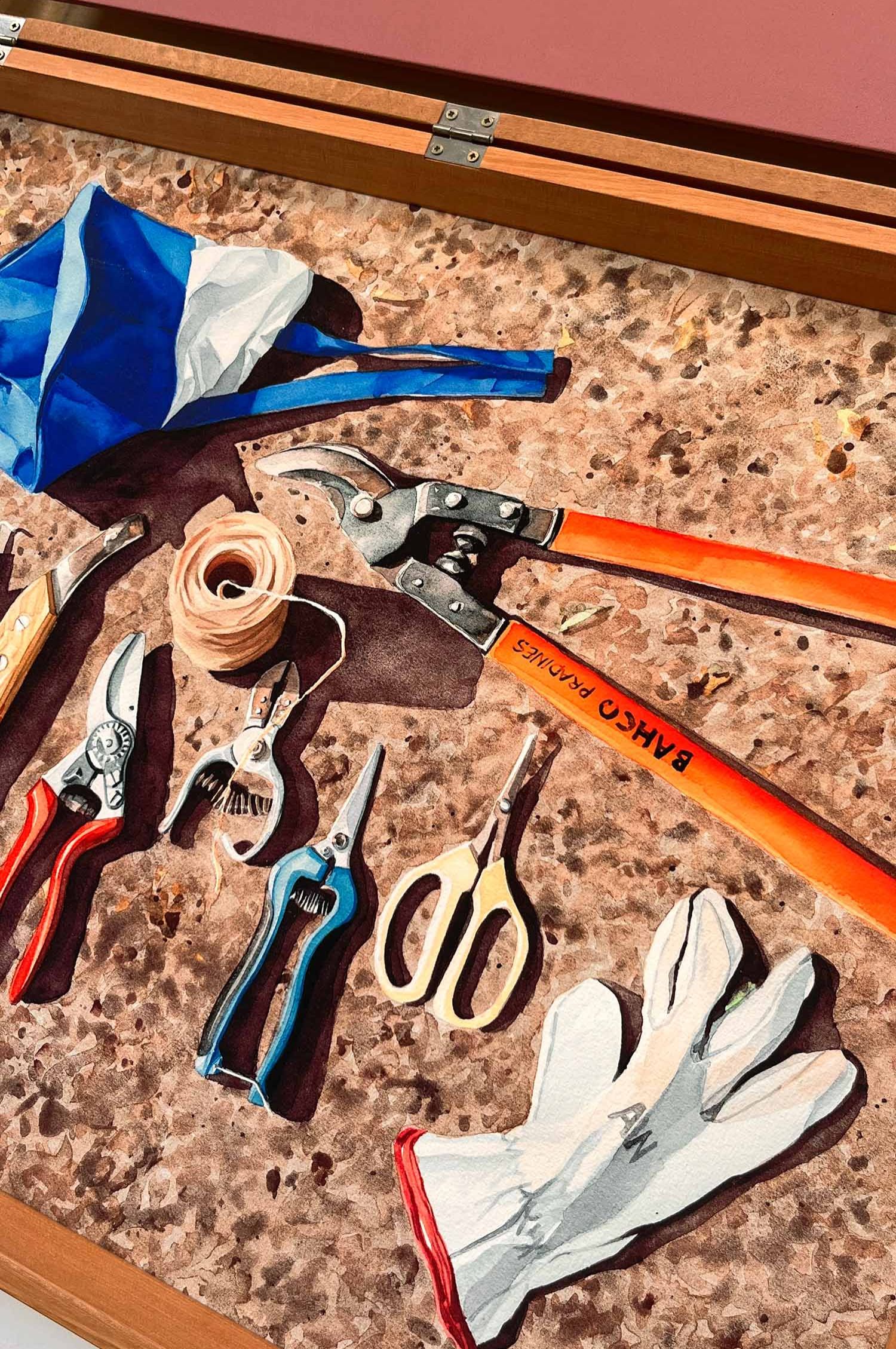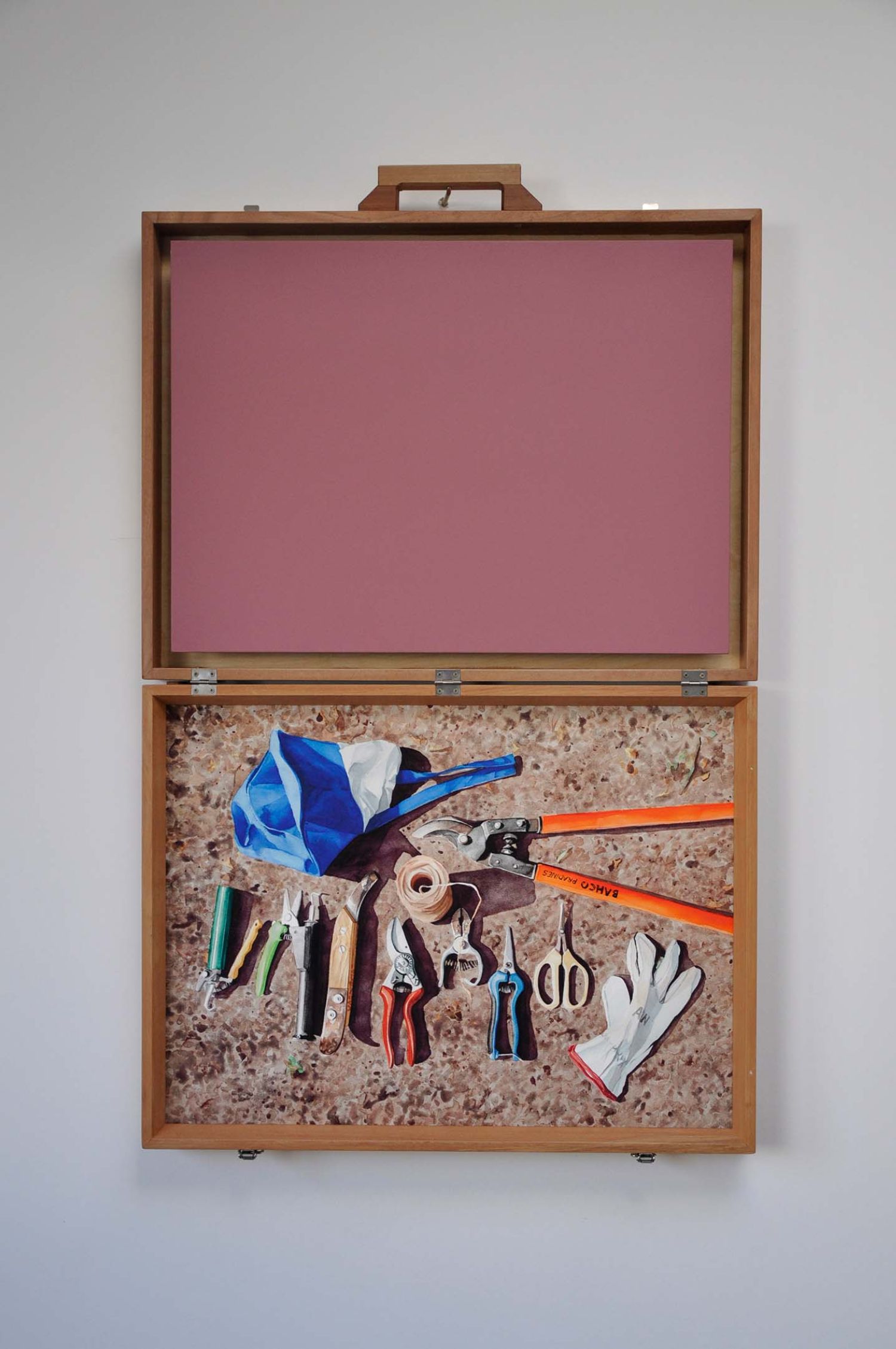 Maletín de madera con impresión Giclée (original en acuarela) y voz de Karen Ravanales, Curimón. Tamaño 61 x 47 x 10 cms.